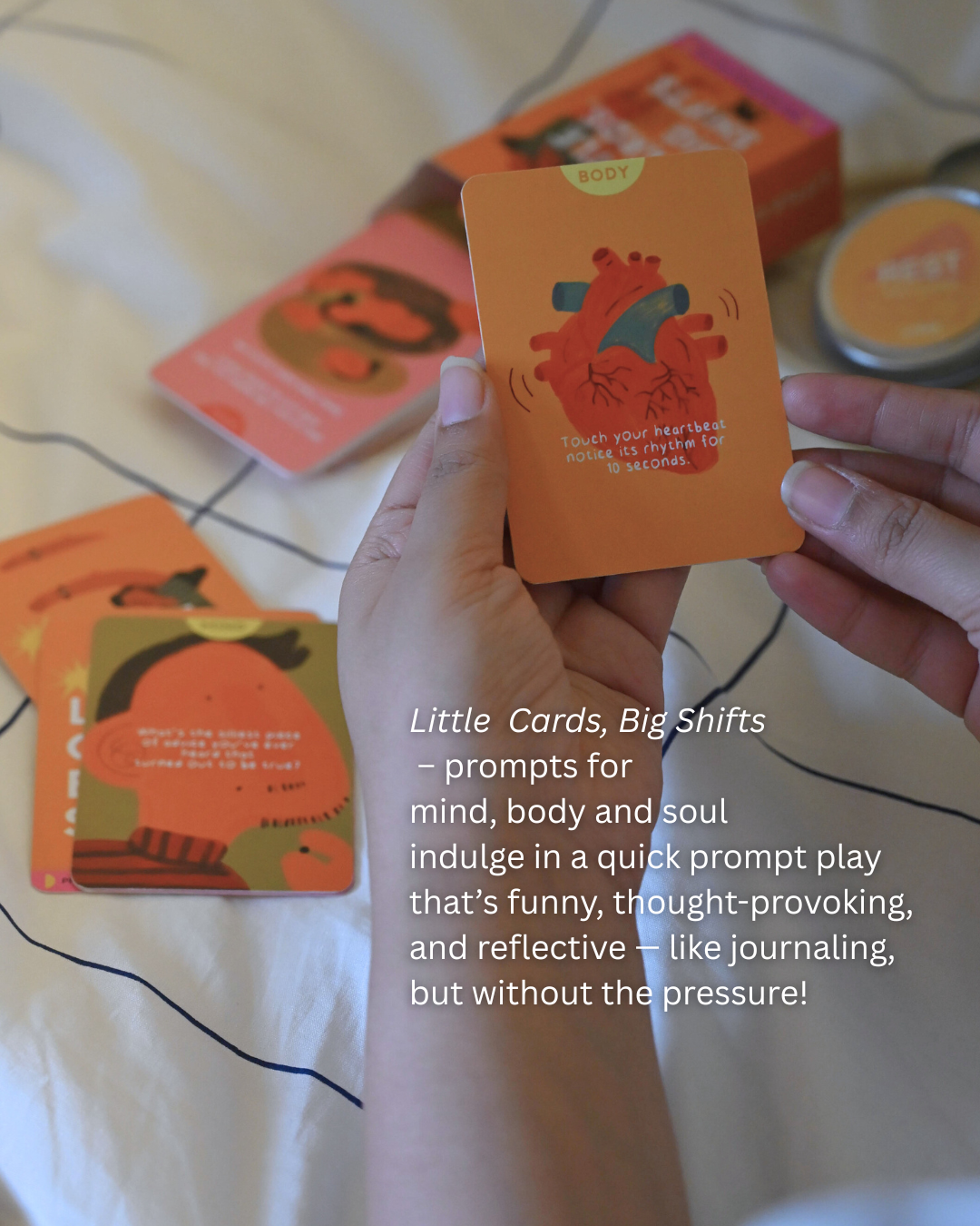 • Play Journal “Little Cards, Big Shifts”: A deck of prompts for the mind, body, and soul - deep, funny, thought-provoking, and delightfully unpredictable.